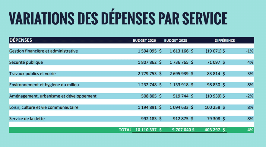 Le budget 2026 présente des augmentations de 8 % en dépenses dans les secteurs suivants : environnement et hygiène du milieu, service de la dette, ainsi que loisir, culture et vie communautaire.