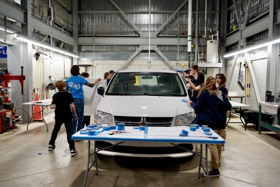 Rendus dans la carrosserie, les élèves doivent mettre du papier pour couvrir les vitres de la voiture le plus rapidement possible.