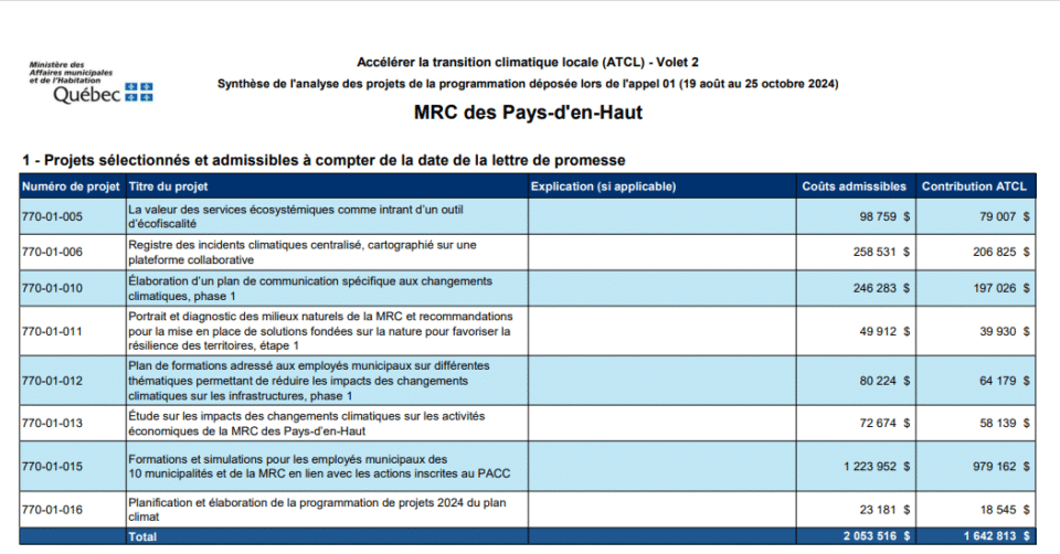 En 2024, la MRC des Pays-d’en-Haut s’est engagée dans l’élaboration d’un Plan climat. Le plan étant présentement partiel, la MRC travaille depuis l’automne dernier sur huit projets prioritaires, financés par le programme Accélérer la transition climatique locale (ATCL) du gouvernement du Québec.