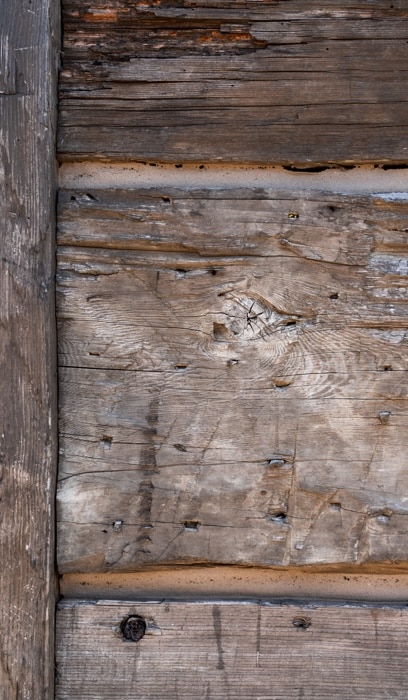 Le revêtement de la maison est fait de vieilles poutres de bois équarries à la hache. Celles-ci ont été fendues en trois. Les côtés rough et travaillés habillent l’extérieur, et les morceaux lisses du centre recouvrent les murs intérieurs. Cela donne l’impression d’une maison pièce sur pièce, mais en fait, elle est isolée au milieu, comme une maison moderne.