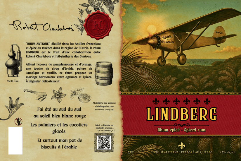 Lindberg n’est pas un rhum comme les autres. Élaboré à Granby, à la distillerie L’Absintherie des Cantons, il est conçu à partir de canne à sucre importée des Antilles françaises, puis transformé localement avec un souci d’authenticité. Au cœur de la recette : des écorces de pamplemousse, des écorces d’orange, du poivre de Jamaïque, du clou de girofle et une touche très spéciale : du sirop d’érable québécois !