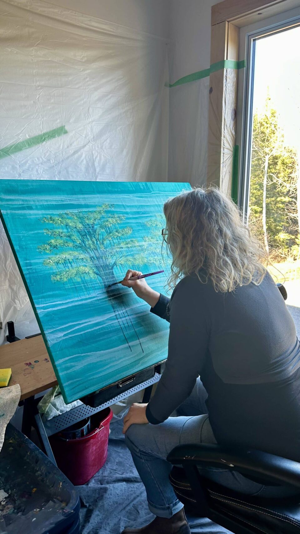 Mais cette nouvelle série s’inscrit dans un moment charnière. « J’ai vécu beaucoup d’événements difficiles », confie-t-elle. Un épuisement professionnel, suivi d’une remise en question majeure. « Il fallait que je retrouve un sens à ma vie. » La réponse s’impose rapidement. « Moi, je suis une artiste. » Elle loue donc un atelier à Val-David, fixe une date d’exposition, et plonge. En deux mois, 17 tableaux prennent forme.