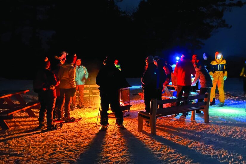 « Profitez d’une belle soirée pour entreprendre une randonnée de raquette éclairée par des flambeaux tout au long du parcours de votre choix, soit ± 2 km ou ± 3,5 km. Dernier départ autorisé à 19h30. »