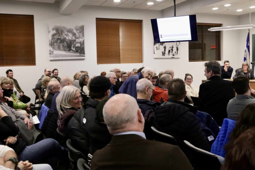 (Photo : Médialo — Louis-Philippe Forest-Gaudet)Citoyens et commerçants devant le conseil municipal de la Ville de Saint-Sauveur. Monsieur Houde, un résident de 101 ans a pris la parole pour défendre l’identité de la région.