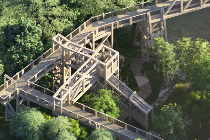 L’un des éléments phares du projet est sans contredit le parcours dans la canopée. Pas moins de 220 mètres de passerelles suspendues permettront de circuler à la cime des arbres. Ponts suspendus, zones de détente et aires de jeu composeront ce secteur intégré à la nature, accessible à un large public, peu importe l’âge ou les capacités physiques.