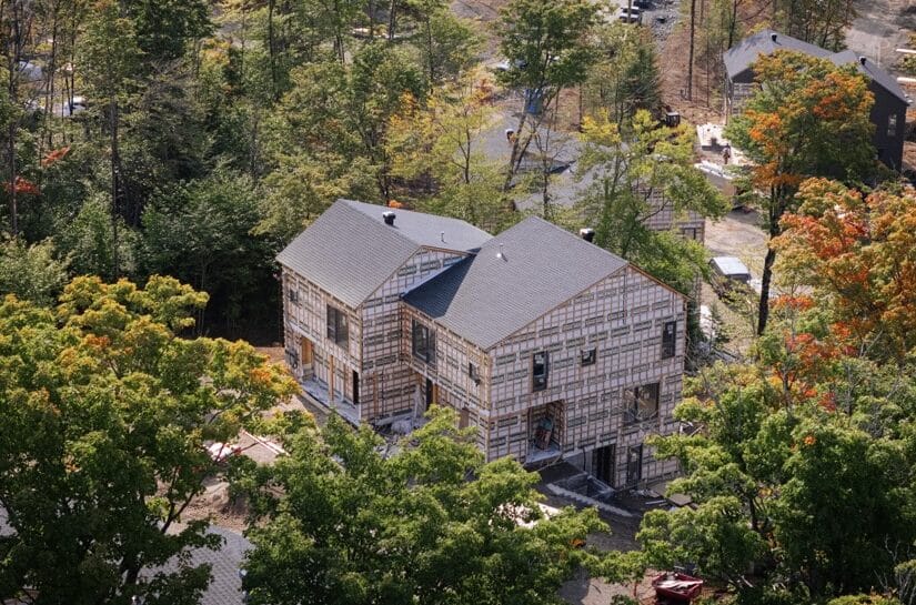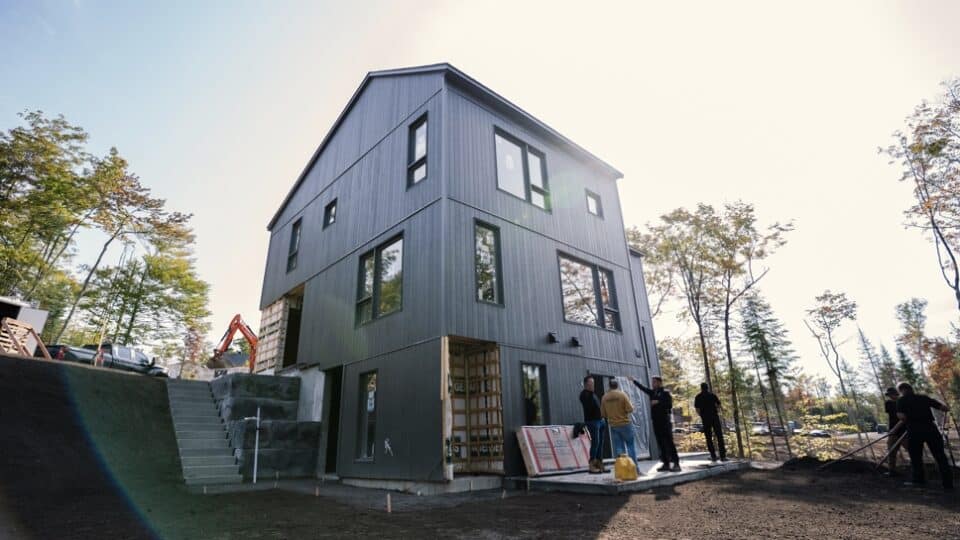 Chaque jour, entre 60 et 80 personnes sont à l’oeuvre sur le chantier de Relief Nord, à Sainte-Adèle. Plus d’une vingtaine de bâtiments sont commencés, ce qui représente presque une centaine d’unités de logement en construction. « Chaque bâtiment a quatre unités, donc ça va vite », explique David Gagné, un des promoteurs et initiateurs du projet, aux côtés de sa conjointe Sophie Marcil et de Simon Bouchard.