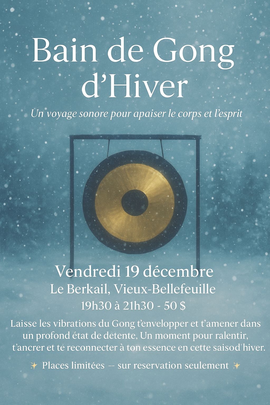 « Viens t’offrir un moment de pure détente et de reconnexion à toi-même pour célébrer l’arrivée de l’hiver. Les vibrations des gongs t’envelopperont, apaisant le mental et harmonisant ton énergie intérieure. »