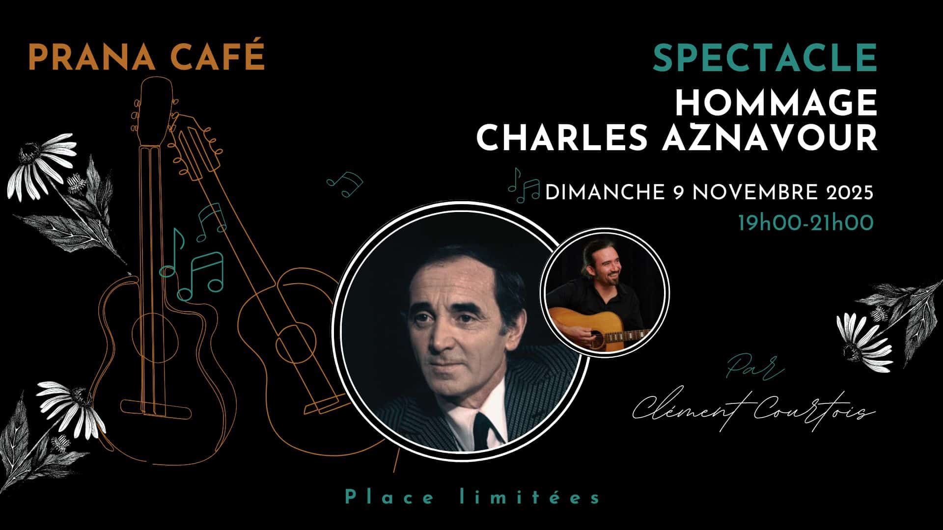« Hommage à Charles Aznavour, par Clément Courtois. Le spectacle débute à 19 h 00. Ouverture des portes à 17 h 00. »