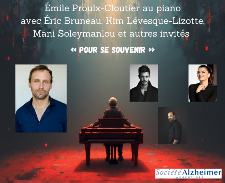 « Cet événement ayant pour titre Pour se souvenir, est présenté dans le cadre d’une levée de fonds pour la Société Alzheimer Laurentides. L’acteur bien connu Éric Bruneau, co-porte-parole de la Fédération québécoise des Sociétés Alzheimer, reçoit sur scène Émile Proulx-Cloutier, un acteur, réalisateur, scénariste, monteur, metteur en scène et compositeur québécois. »