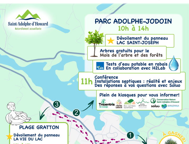 Où : Parc Adolphe-Jodoin, Saint-Adolphe-d’Howard Quand : 7 juin à 10 h « Rendez-vous au parc Adolphe-Jodoin, de 10h à 14h, pour une journée festive, informative et verte ! Au programme : Distribution gratuite d’arbres, test d’eau, conférence inspirante, kiosques d’information etc. »