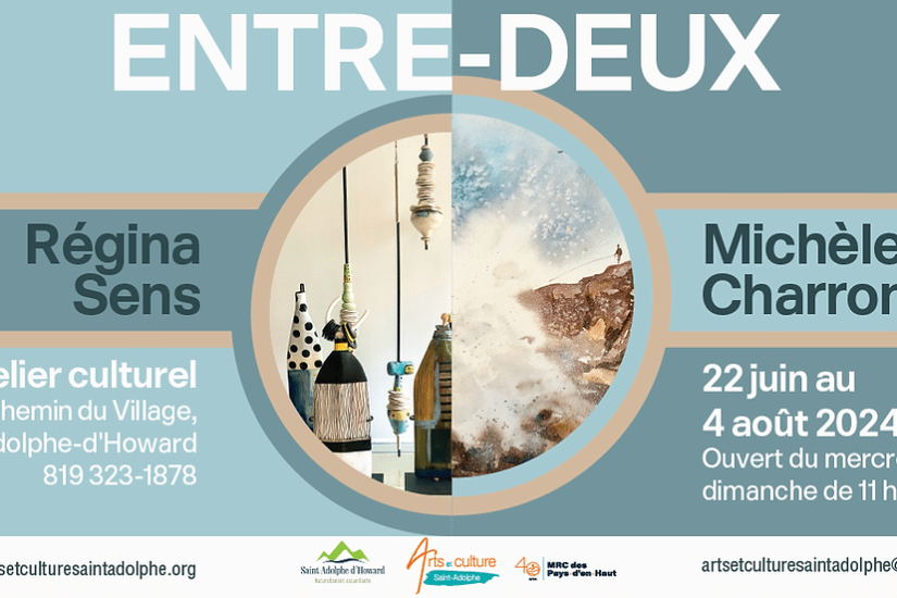 L’exposition Entre-deux est présentée à l’Atelier culturel de Saint-Adolphe-d’Howard du 22 juin au 4 août prochain. «Du 22 juin au 4 août, Arts et culture Saint-Adolphe propose l’exposition des artistes Michèle Charron et Régina Sens. » Pour tous les détails, visitez le site web de l’Atelier culturel.