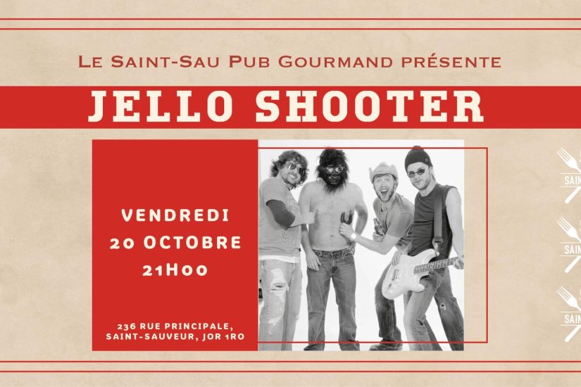 Le 20 octobre, le Saint-Sau Pub Gourmand accueille le groupe Jello Shooter dès 21h. « Les Jello Shooters est un band dont la réputation n’est plus à faire dans les Laurentides… Formé par Jean-François Barbeau, Laurent Bélec, Jean-Francois Prud’Homme et Luc Juteau, il y a presque 15 ans, ce groupe se spécialise dans le classique rock pur et dur! Souvent empreint d’improvisation et de surprise dont ils sont parfois agréablement eux même victime!! » Pour plus d’informations,…