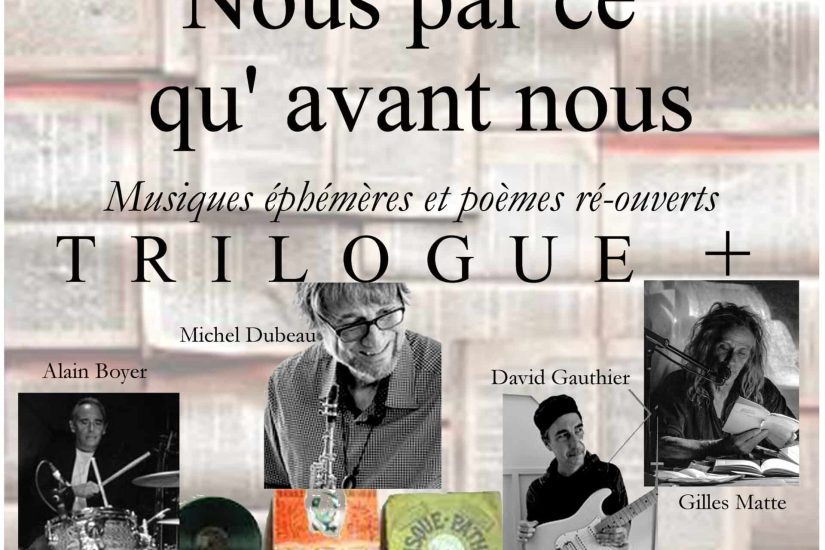 La Maison de la Poésie des Laurentides présente Nous par ce qu’avant nous avec le quatuor expérimental Trilogue+, le 3 mars à 14 h au Café O’Marguerites de Sainte-Marguerite-du-Lac-Masson. « Trilogue c’est Alain Boyer aux textures du rythme, Michel Dubeau sur les hanches du vente et David Gauthier aux élongations de guitare. + c’est Gilles Matte, passager clandestin sur la portée des mots. Pour ce troisième événement, où la poésie navigue sur des sonorités musicales en…